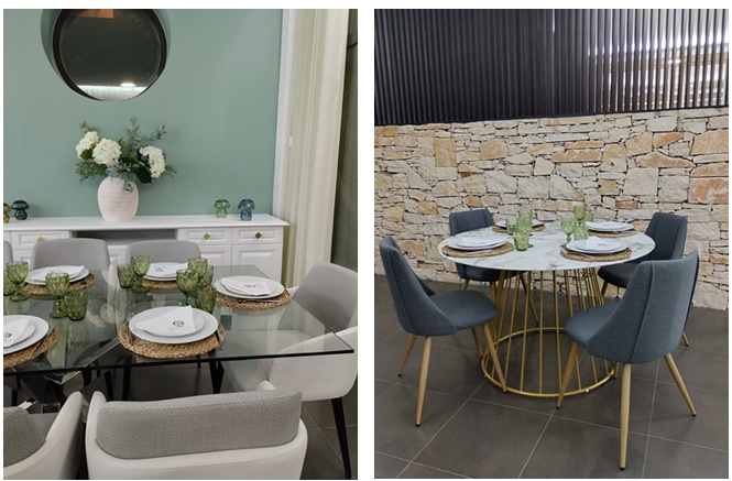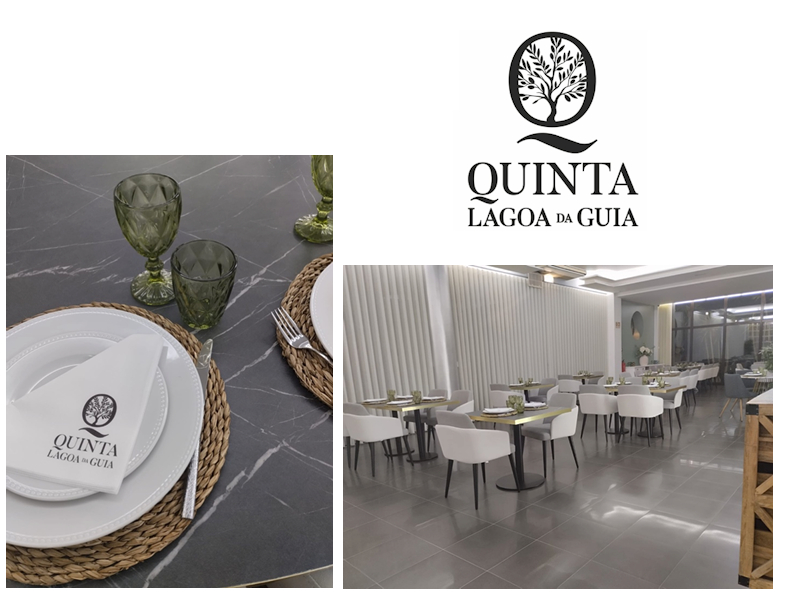 A sala é parcialmente dividida por uma parede de pedra, que acrescenta textura, carácter e autenticidade ao ambiente, criando dois subespaços harmoniosos e visualmente ligados. Esta materialidade reforça a ligação à paisagem mediterrânica que inspira a Quinta.