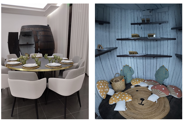 O espaço distingue-se pela elegância do seu logotipo dourado metálico aplicado sobre a parede preta, elemento que marca a identidade visual do restaurante. A madeira natural domina o ambiente através dos revestimentos, mobiliário e carpintaria personalizada.